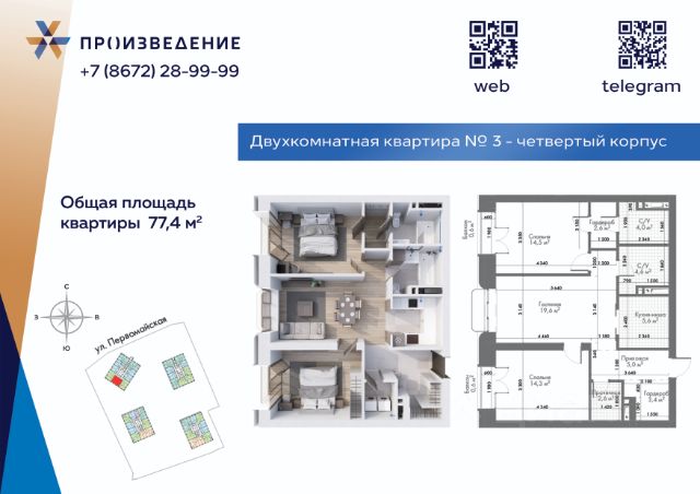 Продаётся 2 - комнатная квартира площадью 77,4 м² на 4 этаже. Квартира расположена в жилом комплексе бизнес-класса "Произведение на Первомайской", который представляет собой современный проект, состоящий из четырех 17-этажных корпусов. Строительство ведется по монолитной технологии с применением передовых инженерных решений, обеспечивающих повышенную сейсмоустойчивость зданий. В проекте представлены разнообразные типы квартир: от 1-комнатных до 4+ комнатных. Площадь квартир варьируется в диапазоне от 40,8 м² до 262 м². Высота потолков в помещениях составляет от 3 метра. Ключевой особенностью проекта являются свободные планировки, которые дают полную свободу для создания любого жизненного сценария. А также есть отделка White Box, что позволит будущим жильцам сразу приступить к реализации собственного дизайн-проекта. Среди нестандартных форматов жилья предусмотрены двухуровневые пентхаусы и квартиры с просторными террасами. Комфорт и безопасность Для комфорта и безопасности жителей в ЖК "Произведение на Первомайской" реализована многоуровневая система защиты. Территория комплекса полностью закрыта от посторонних и свободна от автомобилей, что создает безопасную среду для прогулок. По всему периметру ведется круглосуточное видеонаблюдение, а доступ осуществляется по цифровым ключам. В каждом подъезде установлены пассажирские и грузовые лифты. Для автовладельцев предусмотрен подземный паркинг с прямым доступом на лифте на жилой этаж. Для удобства жителей оборудованы колясочные, велопарковки и индивидуальные кладовые помещения. В лобби круглосуточно дежурит профессиональный консьерж-сервис. Архитектура Архитектурная концепция ЖК "Произведение на Первомайской" разработана с целью создания нового, современного облика городской среды Владикавказа. Форма зданий отличается лаконичностью и чистотой линий. В отделке фасадов используется премиальный материал нового поколения — архитектурный стеклофибробетон. Этот прочный, долговечный и эстетичный материал, применяемый в знаковых мировых объектах, обеспечивает не только уникальный внешний вид, но и сохранение его на десятилетия. Панорамное остекление и французские балконы наполняют квартиры светом и воздухом, создавая ощущение простора. Благоустройство Благоустройство территории ЖК "Произведение на Первомайской" представляет собой полноценную экосистему для жизни и отдыха. Ландшафтный дизайн выполнен с использованием геопластики, создавая разноуровневое озелененное пространство с зонами для тихого отдыха, такими как "секретный сад". На территории обустроены современные детские игровые комплексы с безопасным покрытием и многофункциональные спортивные площадки. Уникальными элементами инфраструктуры являются собственный коворкинг, мужские и женские творческие мастерские, соседский центр (хадзар) и дворовой амфитеатр для проведения мероприятий. Окружение и досуг Жилой комплекс "Произведение на Первомайской" расположен в районе с развитой социальной и досуговой инфраструктурой. В радиусе 1015 минутной пешей Продается 2-комнатная квартира на 4 этаже в Владикавказе.