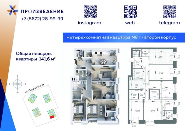 Продаётся 4 - комнатная квартира площадью 111,8м² на 8этаже. Квартира расположена в жилом комплексе бизнес-класса "Произведение на Первомайской", который представляет собой современный проект, состоящий из четырех 17-этажных корпусов. Строительство ведется по монолитной технологии с применением передовых инженерных решений, обеспечивающих повышенную сейсмоустойчивость зданий. В проекте представлены разнообразные типы квартир: от 1-комнатных до 4+ комнатных. Площадь квартир варьируется в диапазоне от 40,8 м² до 262 м². Высота потолков в помещениях составляет от 3 метра. Ключевой особенностью проекта являются свободные планировки, которые дают полную свободу для создания любого жизненного сценария. А также есть отделка White Box, что позволит будущим жильцам сразу приступить к реализации собственного дизайн-проекта. Среди нестандартных форматов жилья предусмотрены двухуровневые пентхаусы и квартиры с просторными террасами. Комфорт и безопасность Для комфорта и безопасности жителей в ЖК "Произведение на Первомайской" реализована многоуровневая система защиты. Территория комплекса полностью закрыта от посторонних и свободна от автомобилей, что создает безопасную среду для прогулок. По всему периметру ведется круглосуточное видеонаблюдение, а доступ осуществляется по цифровым ключам. В каждом подъезде установлены пассажирские и грузовые лифты. Для автовладельцев предусмотрен подземный паркинг с прямым доступом на лифте на жилой этаж. Для удобства жителей оборудованы колясочные, велопарковки и индивидуальные кладовые помещения. В лобби круглосуточно дежурит профессиональный консьерж-сервис. Архитектура Архитектурная концепция ЖК "Произведение на Первомайской" разработана с целью создания нового, современного облика городской среды Владикавказа. Форма зданий отличается лаконичностью и чистотой линий. В отделке фасадов используется премиальный материал нового поколения — архитектурный стеклофибробетон. Этот прочный, долговечный и эстетичный материал, применяемый в знаковых мировых объектах, обеспечивает не только уникальный внешний вид, но и сохранение его на десятилетия. Панорамное остекление и французские балконы наполняют квартиры светом и воздухом, создавая ощущение простора. Благоустройство Благоустройство территории ЖК "Произведение на Первомайской" представляет собой полноценную экосистему для жизни и отдыха. Ландшафтный дизайн выполнен с использованием геопластики, создавая разноуровневое озелененное пространство с зонами для тихого отдыха, такими как "секретный сад". На территории обустроены современные детские игровые комплексы с безопасным покрытием и многофункциональные спортивные площадки. Уникальными элементами инфраструктуры являются собственный коворкинг, мужские и женские творческие мастерские, соседский центр (хадзар) и дворовой амфитеатр для проведения мероприятий. Окружение и досуг Жилой комплекс "Произведение на Первомайской" расположен в районе с развитой социальной и досуговой инфраструктурой. В радиусе 1015 минутной пешей доступно Продам 4-комнатную квартиру в жилом комплексе с кухней гостиной в Владикавказе.