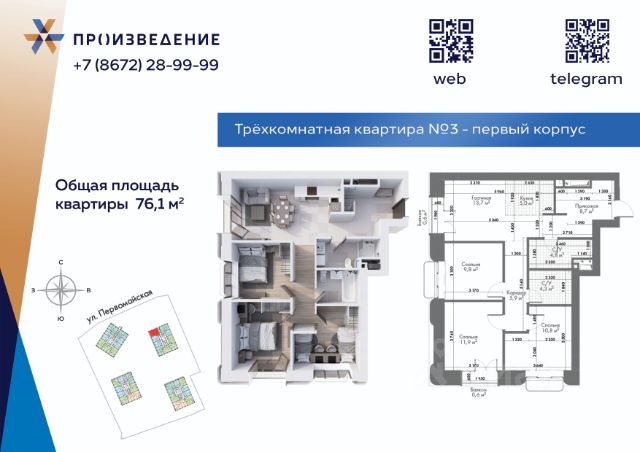 Продаётся 4 - комнатная квартира площадью 99,4 м² на 9 этаже. Квартира расположена в жилом комплексе бизнес-класса "Произведение на Первомайской", который представляет собой современный проект, состоящий из четырех 17-этажных корпусов. Строительство ведется по монолитной технологии с применением передовых инженерных решений, обеспечивающих повышенную сейсмоустойчивость зданий. В проекте представлены разнообразные типы квартир: от 1-комнатных до 4+ комнатных. Площадь квартир варьируется в диапазоне от 40,8 м² до 262 м². Высота потолков в помещениях составляет от 3 метра. Ключевой особенностью проекта являются свободные планировки, которые дают полную свободу для создания любого жизненного сценария. А также есть отделка White Box, что позволит будущим жильцам сразу приступить к реализации собственного дизайн-проекта. Среди нестандартных форматов жилья предусмотрены двухуровневые пентхаусы и квартиры с просторными террасами. Комфорт и безопасность Для комфорта и безопасности жителей в ЖК "Произведение на Первомайской" реализована многоуровневая система защиты. Территория комплекса полностью закрыта от посторонних и свободна от автомобилей, что создает безопасную среду для прогулок. По всему периметру ведется круглосуточное видеонаблюдение, а доступ осуществляется по цифровым ключам. В каждом подъезде установлены пассажирские и грузовые лифты. Для автовладельцев предусмотрен подземный паркинг с прямым доступом на лифте на жилой этаж. Для удобства жителей оборудованы колясочные, велопарковки и индивидуальные кладовые помещения. В лобби круглосуточно дежурит профессиональный консьерж-сервис. Архитектура Архитектурная концепция ЖК "Произведение на Первомайской" разработана с целью создания нового, современного облика городской среды Владикавказа. Форма зданий отличается лаконичностью и чистотой линий. В отделке фасадов используется премиальный материал нового поколения — архитектурный стеклофибробетон. Этот прочный, долговечный и эстетичный материал, применяемый в знаковых мировых объектах, обеспечивает не только уникальный внешний вид, но и сохранение его на десятилетия. Панорамное остекление и французские балконы наполняют квартиры светом и воздухом, создавая ощущение простора. Благоустройство Благоустройство территории ЖК "Произведение на Первомайской" представляет собой полноценную экосистему для жизни и отдыха. Ландшафтный дизайн выполнен с использованием геопластики, создавая разноуровневое озелененное пространство с зонами для тихого отдыха, такими как "секретный сад". На территории обустроены современные детские игровые комплексы с безопасным покрытием и многофункциональные спортивные площадки. Уникальными элементами инфраструктуры являются собственный коворкинг, мужские и женские творческие мастерские, соседский центр (хадзар) и дворовой амфитеатр для проведения мероприятий. Окружение и досуг Жилой комплекс "Произведение на Первомайской" расположен в районе с развитой социальной и досуговой инфраструктурой. В радиусе 1015 минутной пешей