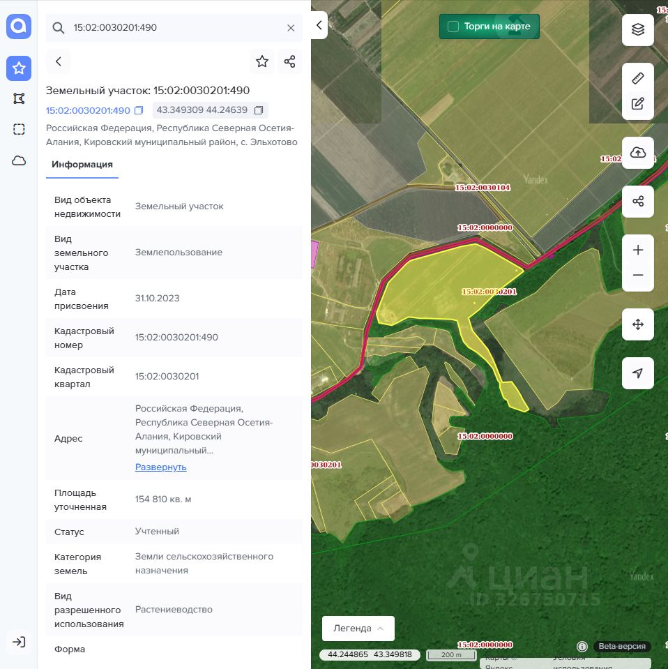 Земельный участок с кадастровым номером 15:02:0030201:490 площадь 154810 по адресу Российская Федерация, Республика Северная Осетия-Алания, Кировский муниципальный район, с. Эльхотово