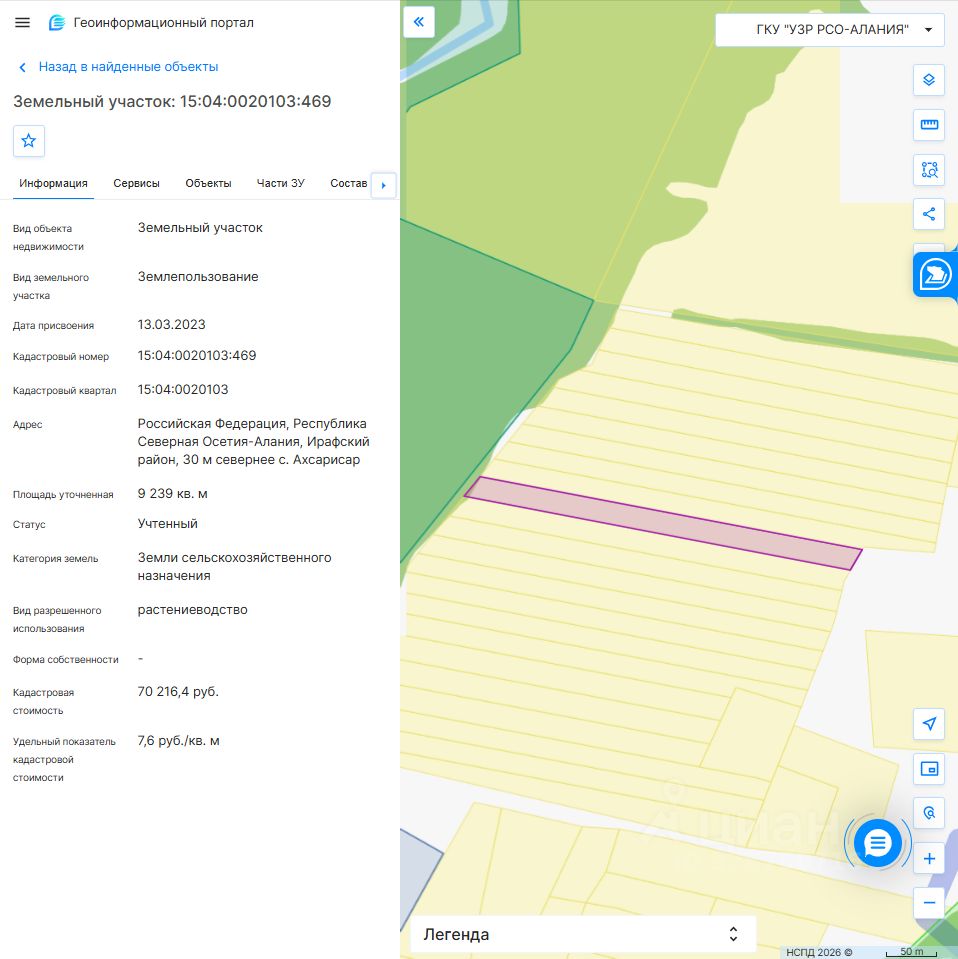 Земельный участок с кадастровым номером 15:04:0020103:469 площадь 9239 по адресу Российская Федерация, Республика Северная Осетия-Алания, Ирафский район, 30 м севернее с. Ахсарисар