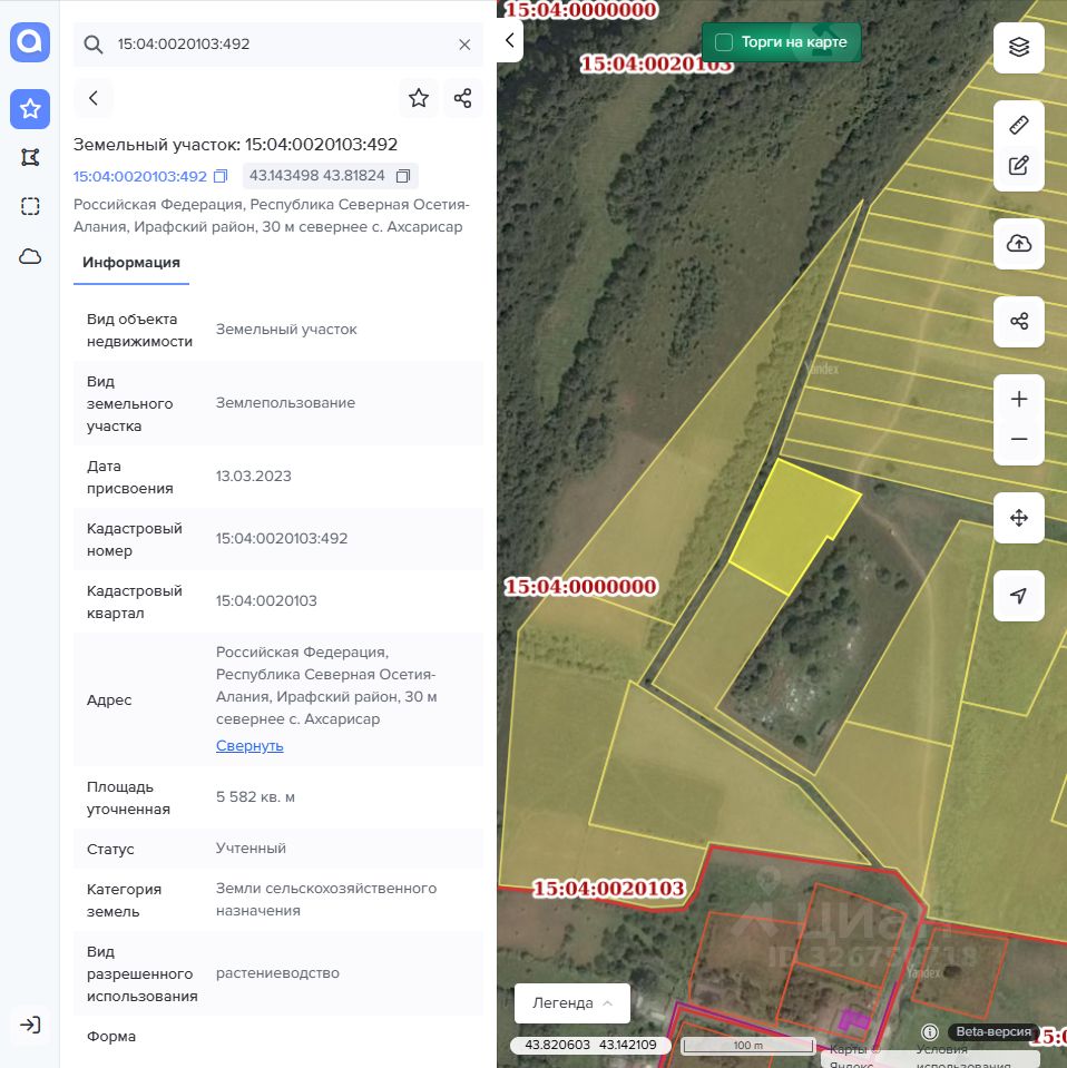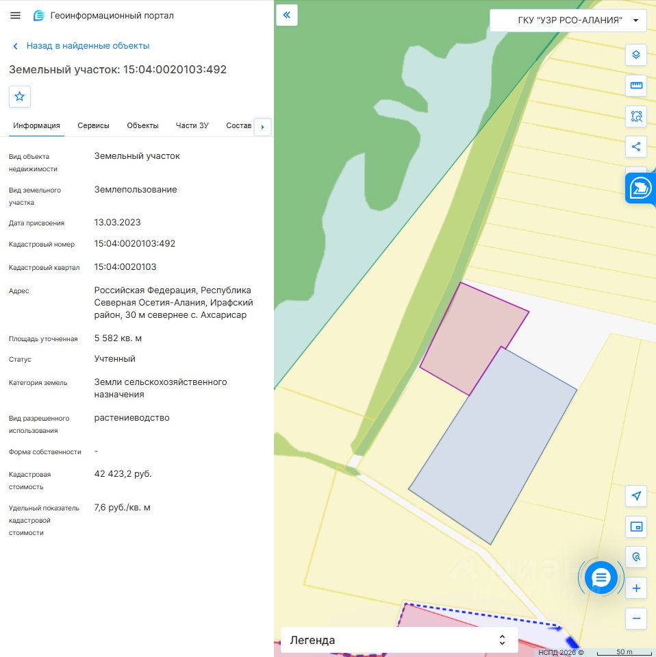 Земельный участок с кадастровым номером 15:04:0020103:492 площадь 5582 по адресу Российская Федерация, Республика Северная Осетия-Алания, Ирафский район, 30 м севернее с. Ахсарисар