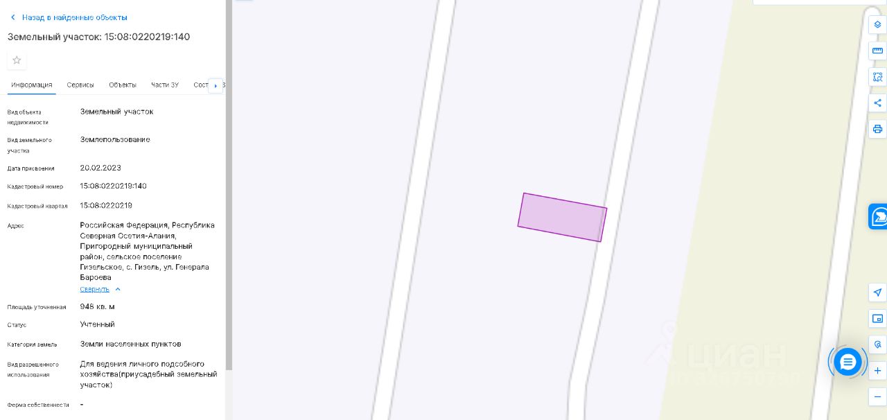 земельный участок с КН 15:08:0220219:140 площадью 948 кв.м., из категории земель населенных пунктов, расположенный: Республика Северная Осетия, Пригородный район, с. Гизель, ул. Генерала Бароева с видом разрешенного использования обслуживание жилой застройки