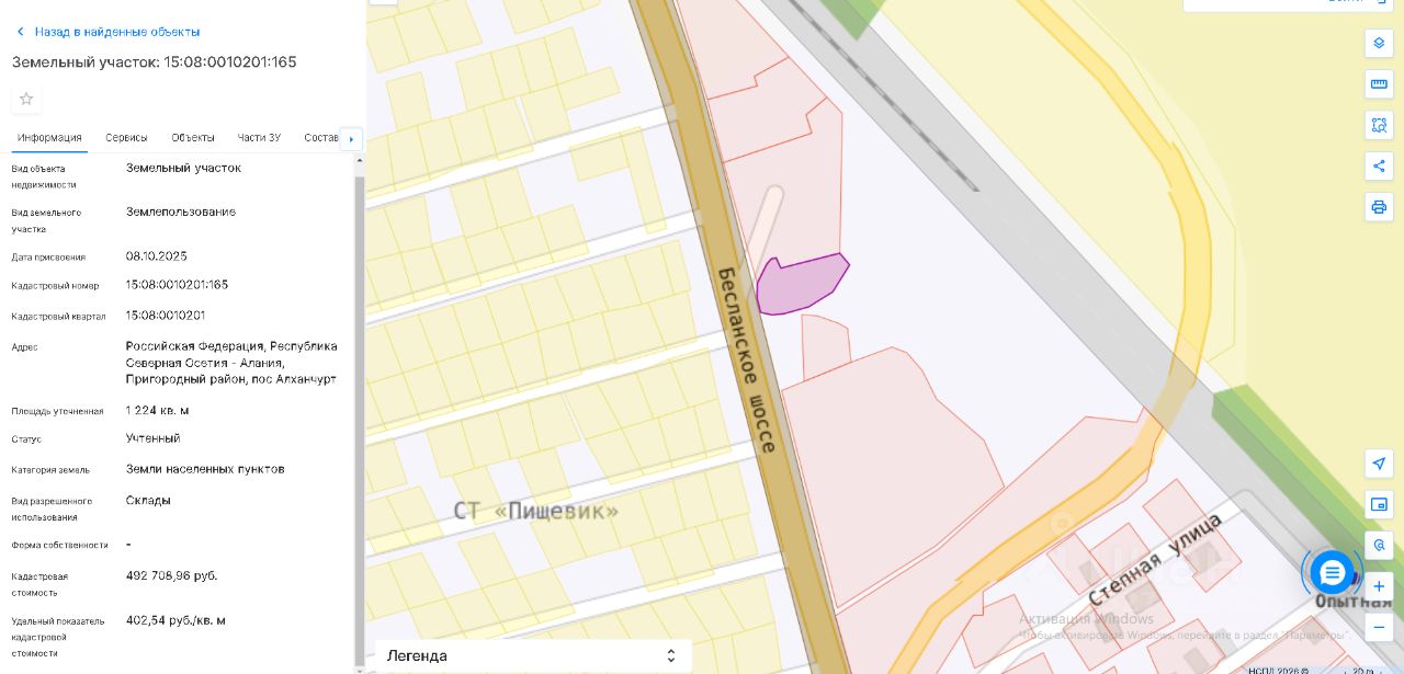 Земельный участок с кадастровым номером 15:08:0010201:165 площадь 1224 по адресу Российская Федерация, Республика Северная Осетия - Алания, Пригородный район, пос Алханчурт
