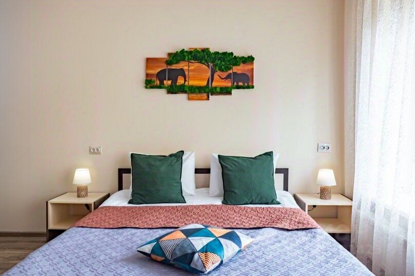 Двуспальная кровать с ортопедическим матрасом и чистым постельным бельем для комфортного отдыха.
