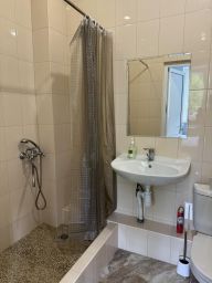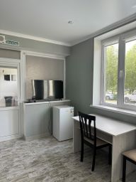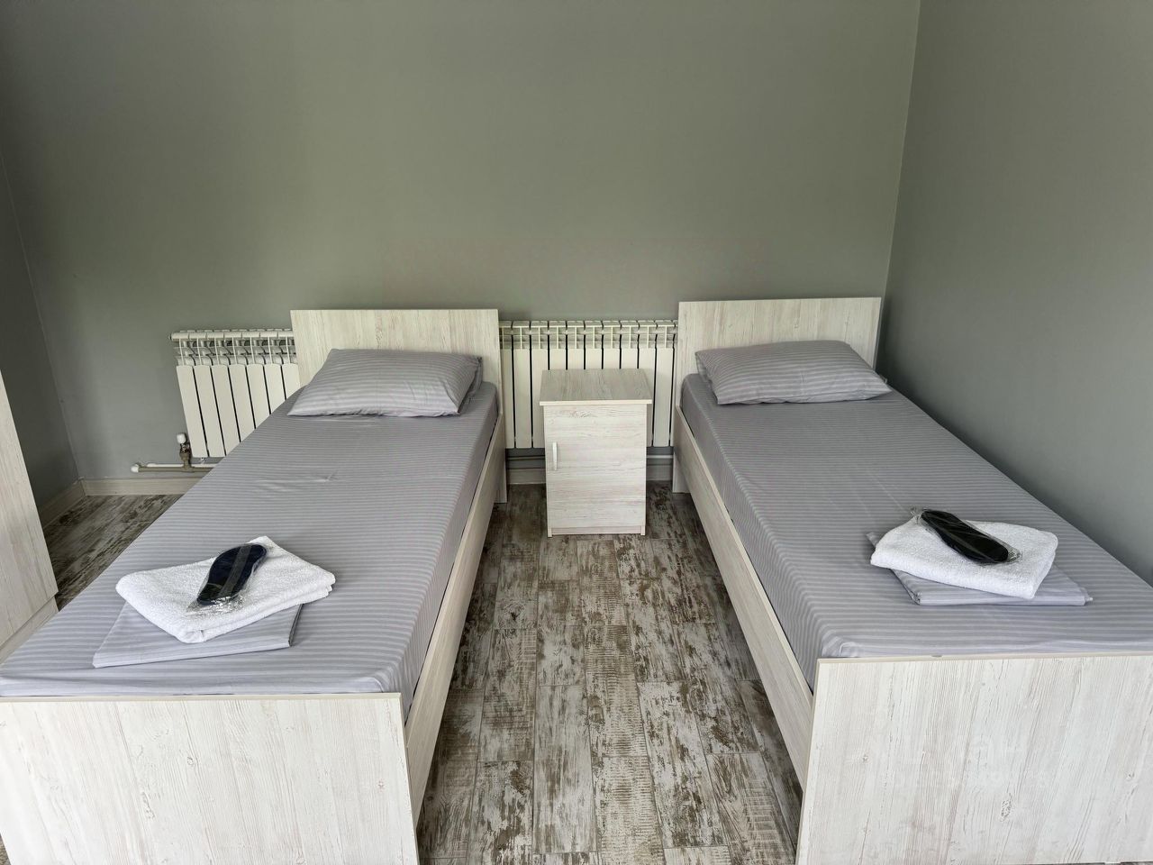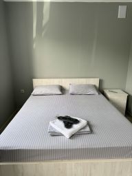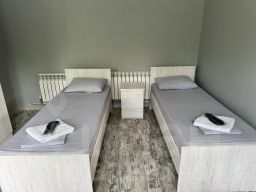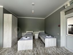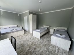 Четырехместный номер с собственной ванной комнатной, телевизором, мини холодильником. В номере одна двуспальная кровать и две односпальные. Предоставляется постельное белье, полотенца, одноразовые тапочки, мыльные принадлежности и фен.
