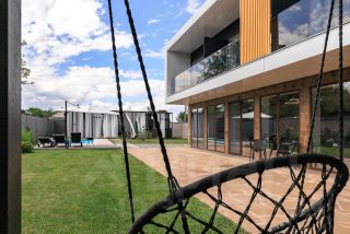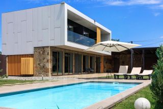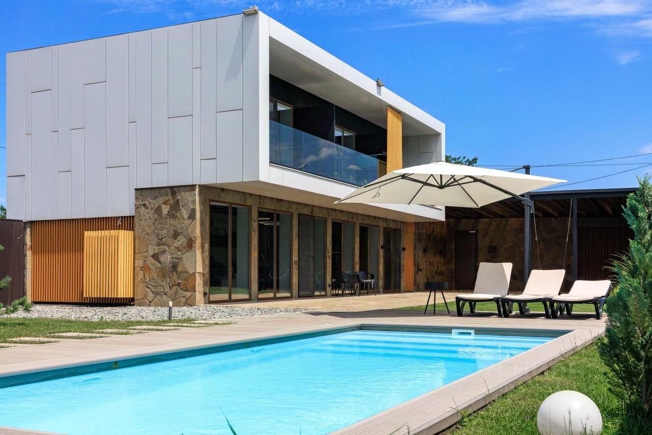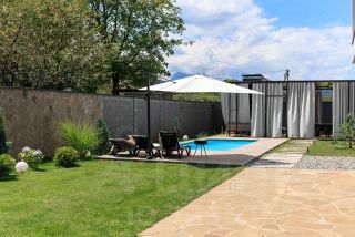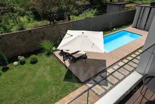 Во дворе расположен бассейн размерами 7х3 метра и глубиной 1,5 метров. Бассейн оснащен гидромассажем и противотоком для плавания. Прилегающая территория отделана террасной доской с зоной для загара и отдыха.