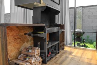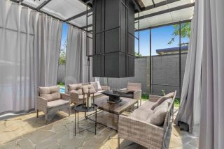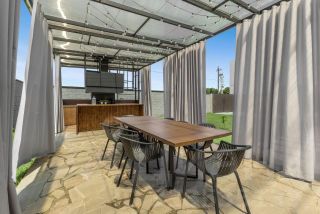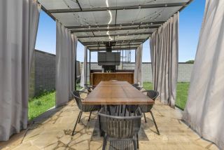 Зона Патио для отдыха на свежем воздухе, расположенная в дальнем углу участка с оборудованной мангальной зоной, столовой на 10 посадочных мест и уютной диванной зоной с открытым камином-костровой чашей.