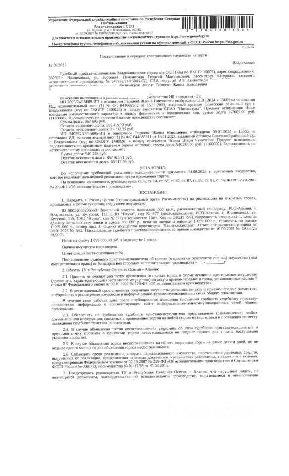 земельный участок КН 15:09:0021701:2373, категория земель земли населенных пунктов, вид разрешенного использования для коллективного садоводства. общей площадью 500 кв.м., расположенный по адресу: РСО-Алания, г.Владикавказ, ул.Кутузова, 115, СНО "Наука", сад 877.