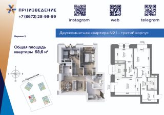 Продаётся 2-комнатная квартира в строящемся доме (корпус 4), срок сдачи: IV-кв. 2025, общей площадью 68.6 кв.м., на 7 этаже. "Произведение на Первомайской" — это жилой комплекс бизнес-класса. Имеет удобное расположение, современную архитектуру, продуманный дизайн внутренних пространств, благоустроенный двор и собственную инфраструктуру.