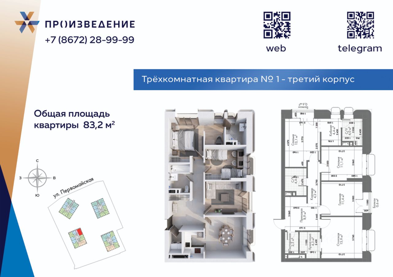 Продаётся 3 - комнатная квартира площадью 83,2м² на 9этаже. Квартира расположена в жилом комплексе бизнес-класса "Произведение на Первомайской", который представляет собой современный проект, состоящий из четырех 17-этажных корпусов. Строительство ведется по монолитной технологии с применением передовых инженерных решений, обеспечивающих повышенную сейсмоустойчивость зданий.