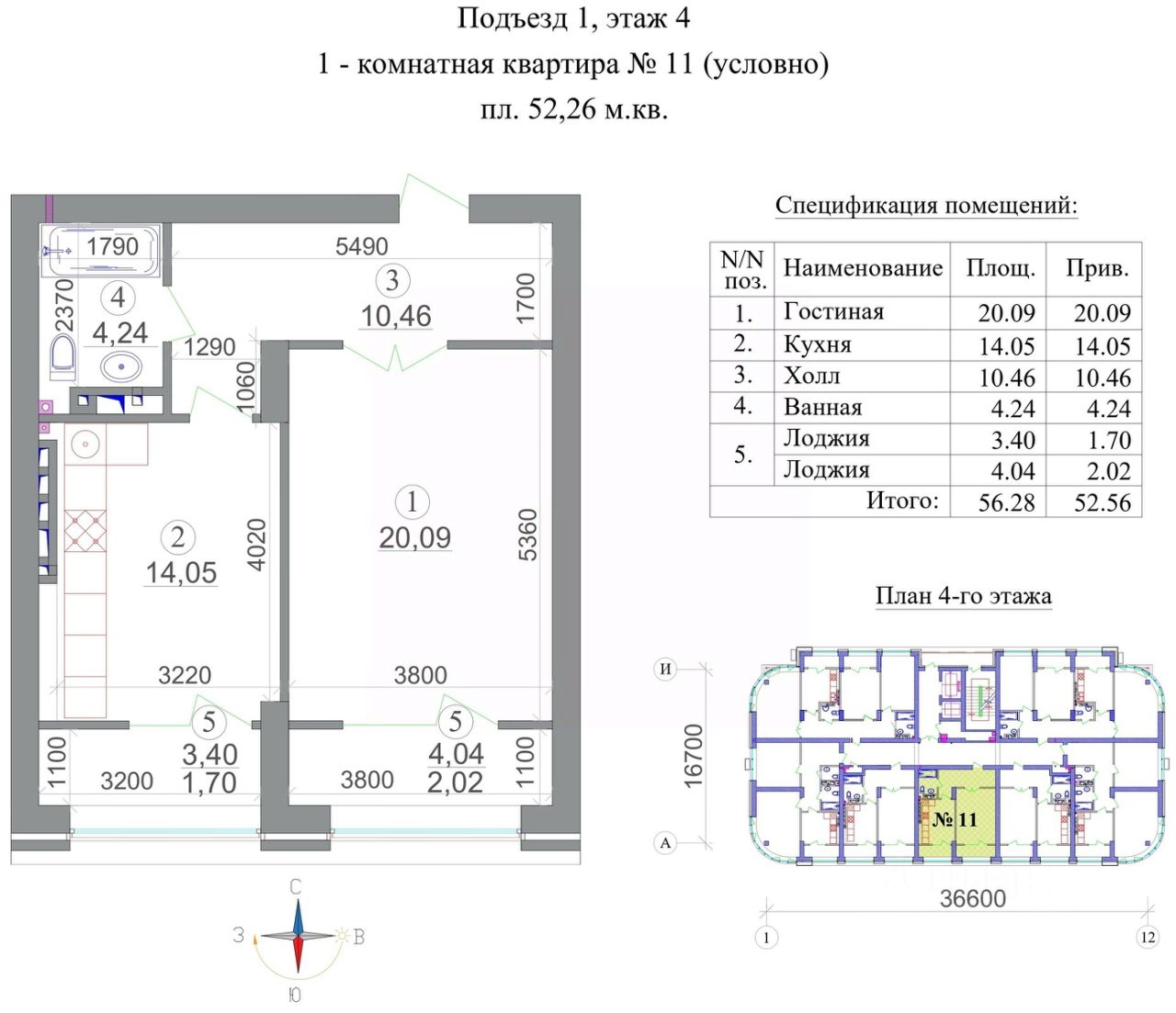 Общая площадь52,56 м²