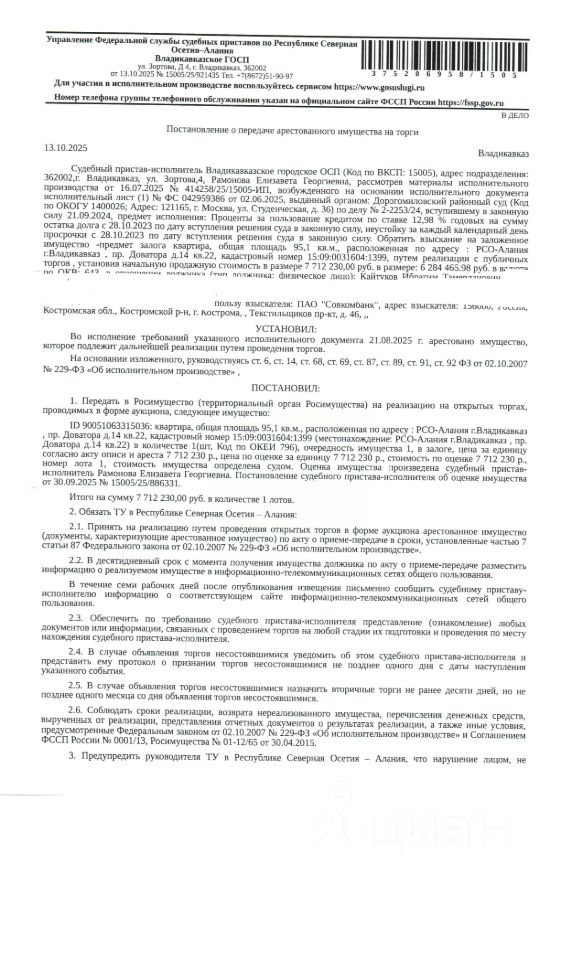 жилое помещение КН 15:09:0031604:1399, общей площадью 95,1 кв.м., расположенное по адресу: РСО-Алания, г.Владикавказ, проспект Доватора, 14 кв. 22.