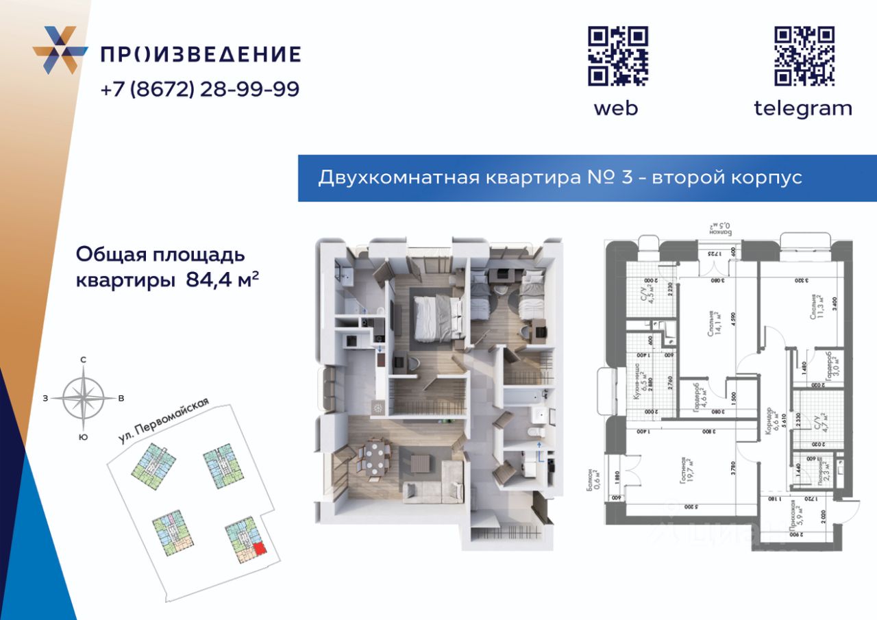Продаётся 2 - комнатная квартира площадью 84,4 м² на 4 этаже. Квартира расположена в жилом комплексе бизнес-класса "Произведение на Первомайской", который представляет собой современный проект, состоящий из четырех 17-этажных корпусов. Строительство ведется по монолитной технологии с применением передовых инженерных решений, обеспечивающих повышенную сейсмоустойчивость зданий.
