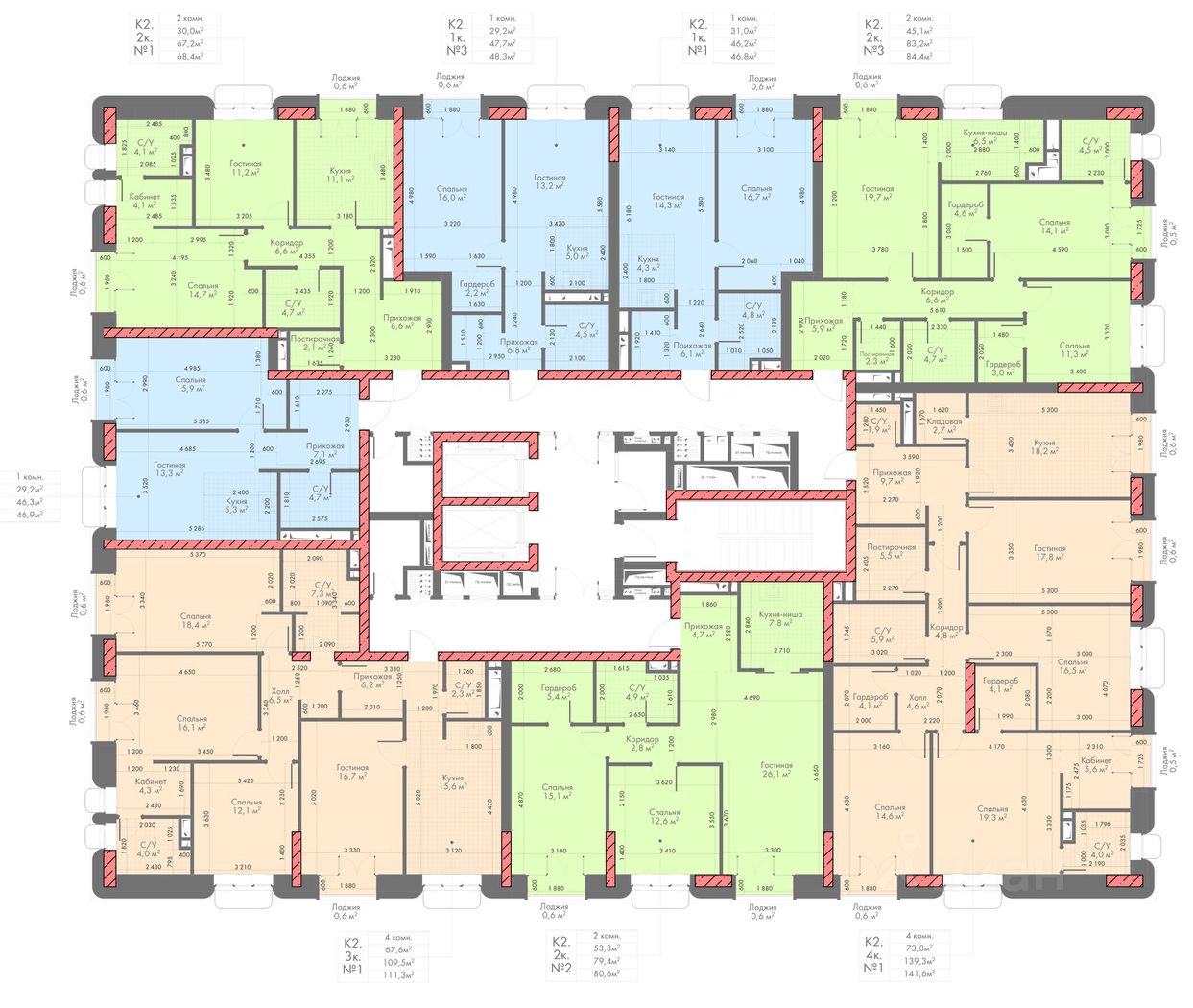 В проекте представлены разнообразные типы квартир: от 1-комнатных до 4+ комнатных. Площадь квартир варьируется в диапазоне от 40,8 м² до 262 м². Высота потолков в помещениях составляет от 3 метра.