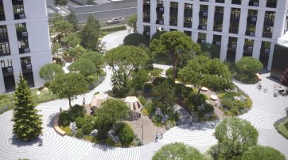 Благоустройство территории ЖК "Произведение на Первомайской" представляет собой полноценную экосистему для жизни и отдыха. Ландшафтный дизайн выполнен с использованием геопластики, создавая разноуровневое озелененное пространство с зонами для тихого отдыха, такими как "секретный сад". На территории обустроены современные детские игровые комплексы с безопасным покрытием и многофункциональные спортивные площадки. Уникальными элементами инфраструктуры являются собственный коворкинг, мужские и женские творческие мастерские, соседский центр (хадзар) и дворовой амфитеатр для проведения мероприятий.