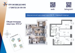 Продаётся 2 - комнатная квартира площадью 67,5 м² на 10 этаже. Квартира расположена в жилом комплексе бизнес-класса "Произведение на Первомайской", который представляет собой современный проект, состоящий из четырех 17-этажных корпусов. Строительство ведется по монолитной технологии с применением передовых инженерных решений, обеспечивающих повышенную сейсмоустойчивость зданий.