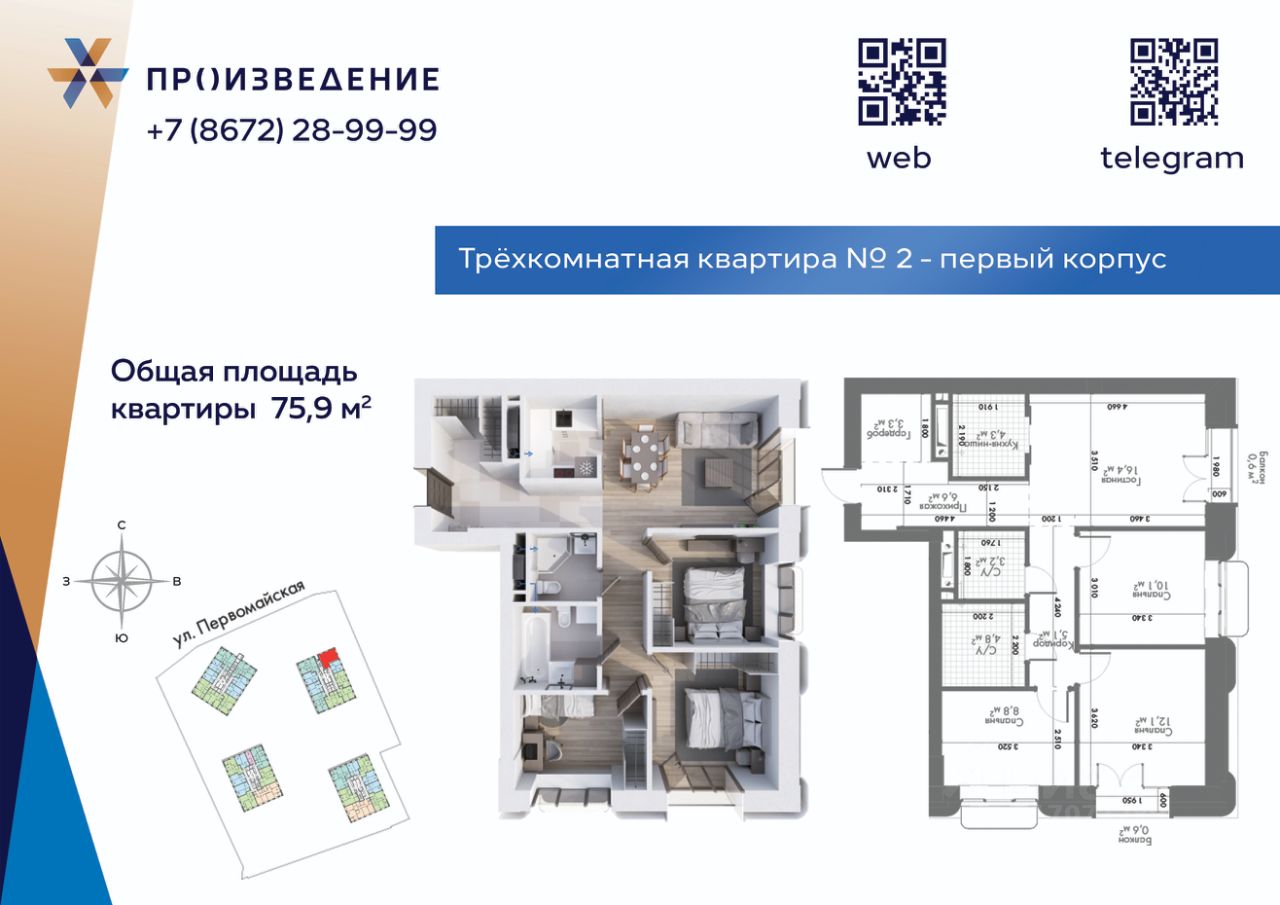 Продаётся 3 - комнатная квартира площадью 75,9 м² на 12 этаже. Квартира расположена в жилом комплексе бизнес-класса "Произведение на Первомайской", который представляет собой современный проект, состоящий из четырех 17-этажных корпусов. Строительство ведется по монолитной технологии с применением передовых инженерных решений, обеспечивающих повышенную сейсмоустойчивость зданий.