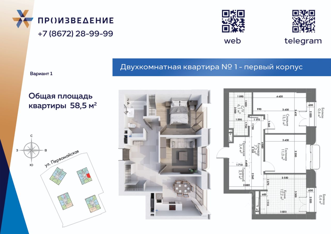 Продаётся 2 - комнатная квартира площадью 58,5 м² на 8 этаже. Квартира расположена в жилом комплексе бизнес-класса "Произведение на Первомайской", который представляет собой современный проект, состоящий из четырех 17-этажных корпусов. Строительство ведется по монолитной технологии с применением передовых инженерных решений, обеспечивающих повышенную сейсмоустойчивость зданий.