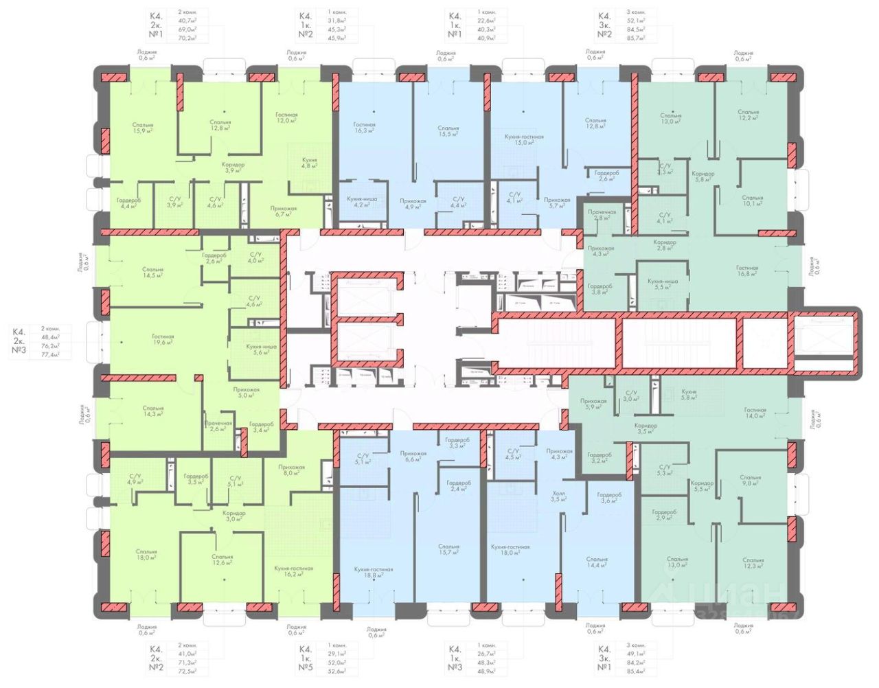 В проекте представлены разнообразные типы квартир: от 1-комнатных до 4+ комнатных. Площадь квартир варьируется в диапазоне от 40,8 м² до 262 м². Высота потолков в помещениях составляет от 3 метра.