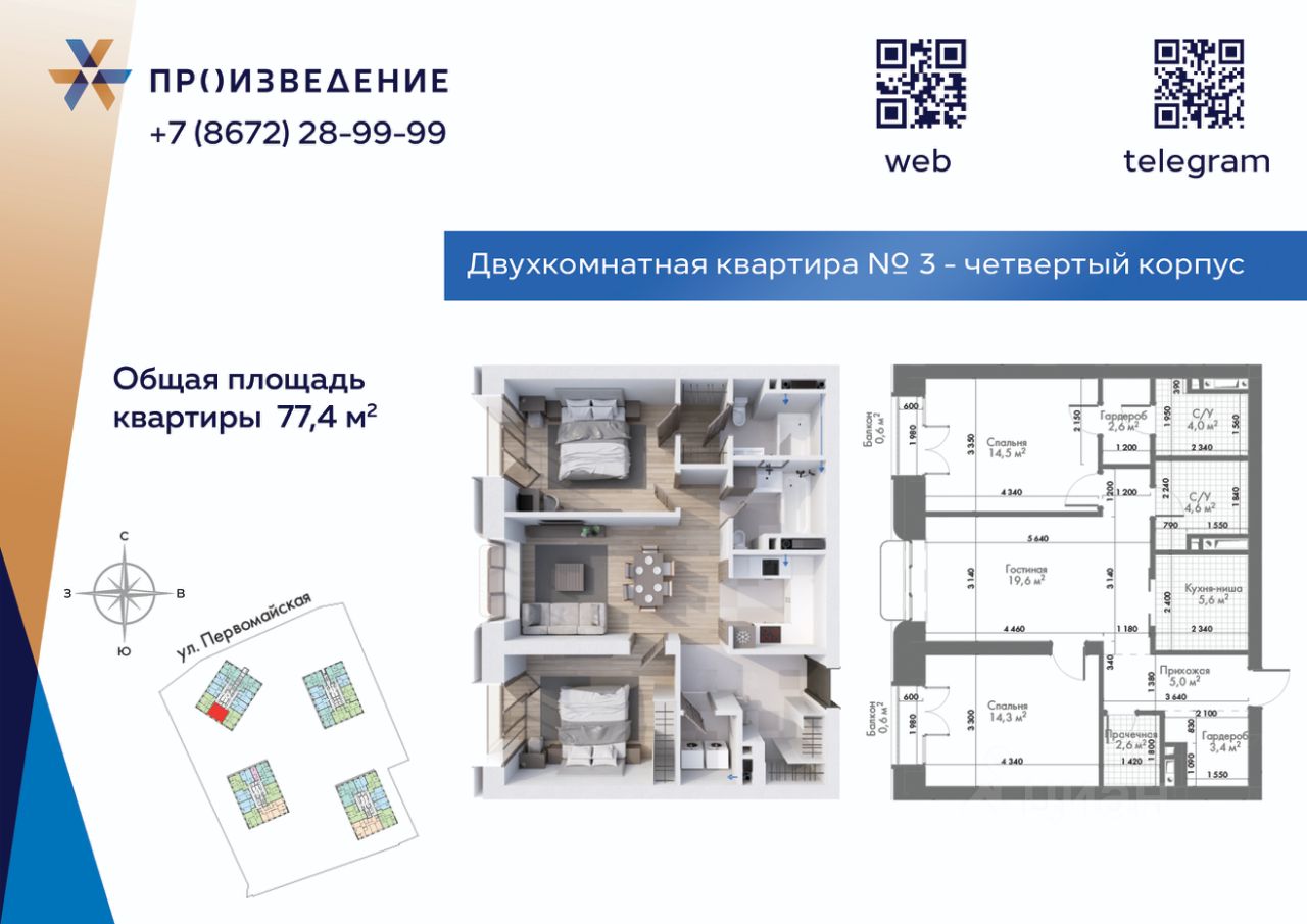 Продаётся 2 - комнатная квартира площадью 77,4 м² на 4 этаже. Квартира расположена в жилом комплексе бизнес-класса "Произведение на Первомайской", который представляет собой современный проект, состоящий из четырех 17-этажных корпусов. Строительство ведется по монолитной технологии с применением передовых инженерных решений, обеспечивающих повышенную сейсмоустойчивость зданий.