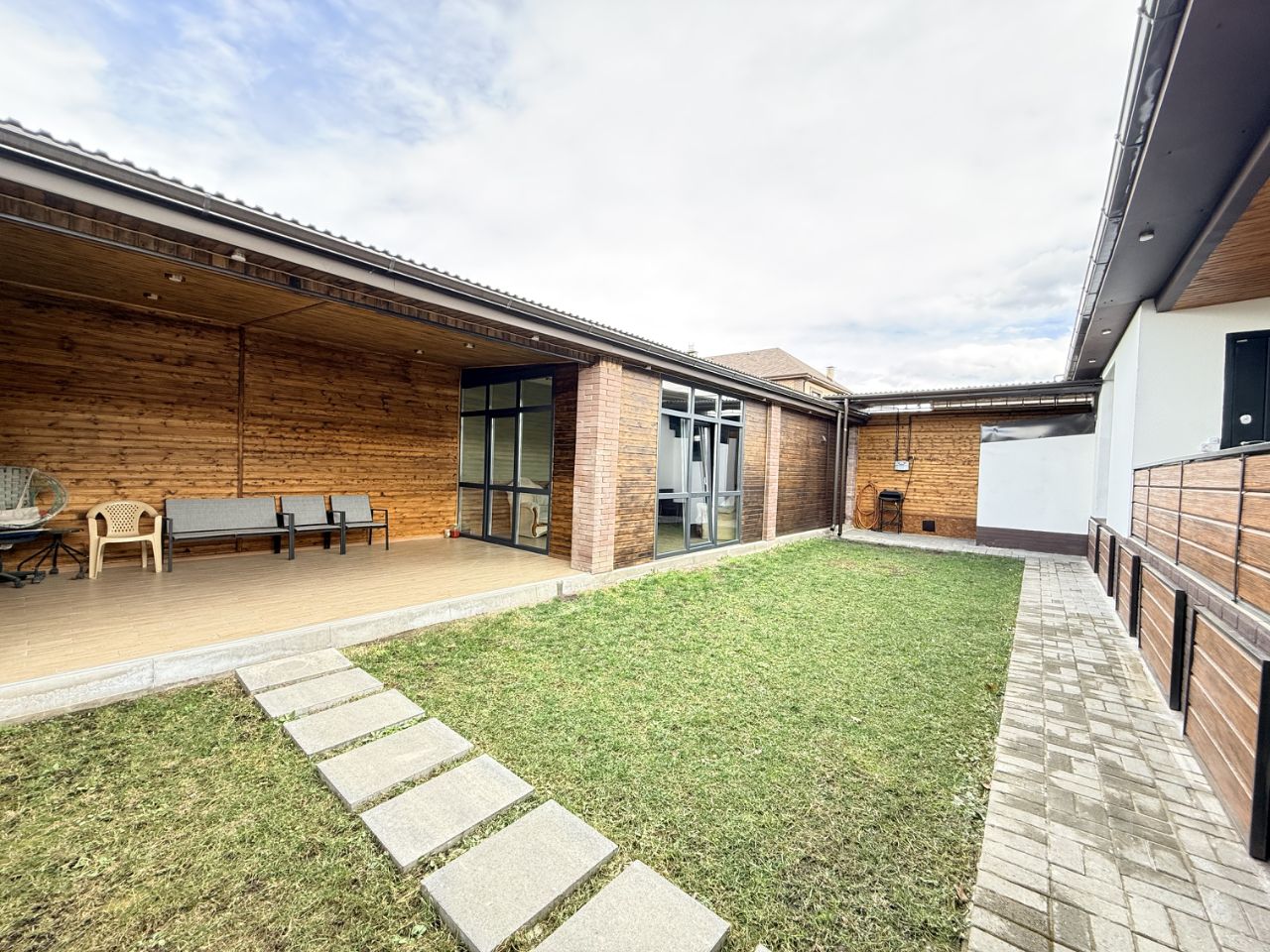 Из дома есть удобный задний выход прямо на террасу — идеальное место, где утро начинается с чашки кофе, а вечера проходят в уютных разговорах с близкими. Здесь приятно встречать рассветы, устраивать семейные ужины на свежем воздухе или просто отдыхать после рабочего дня.